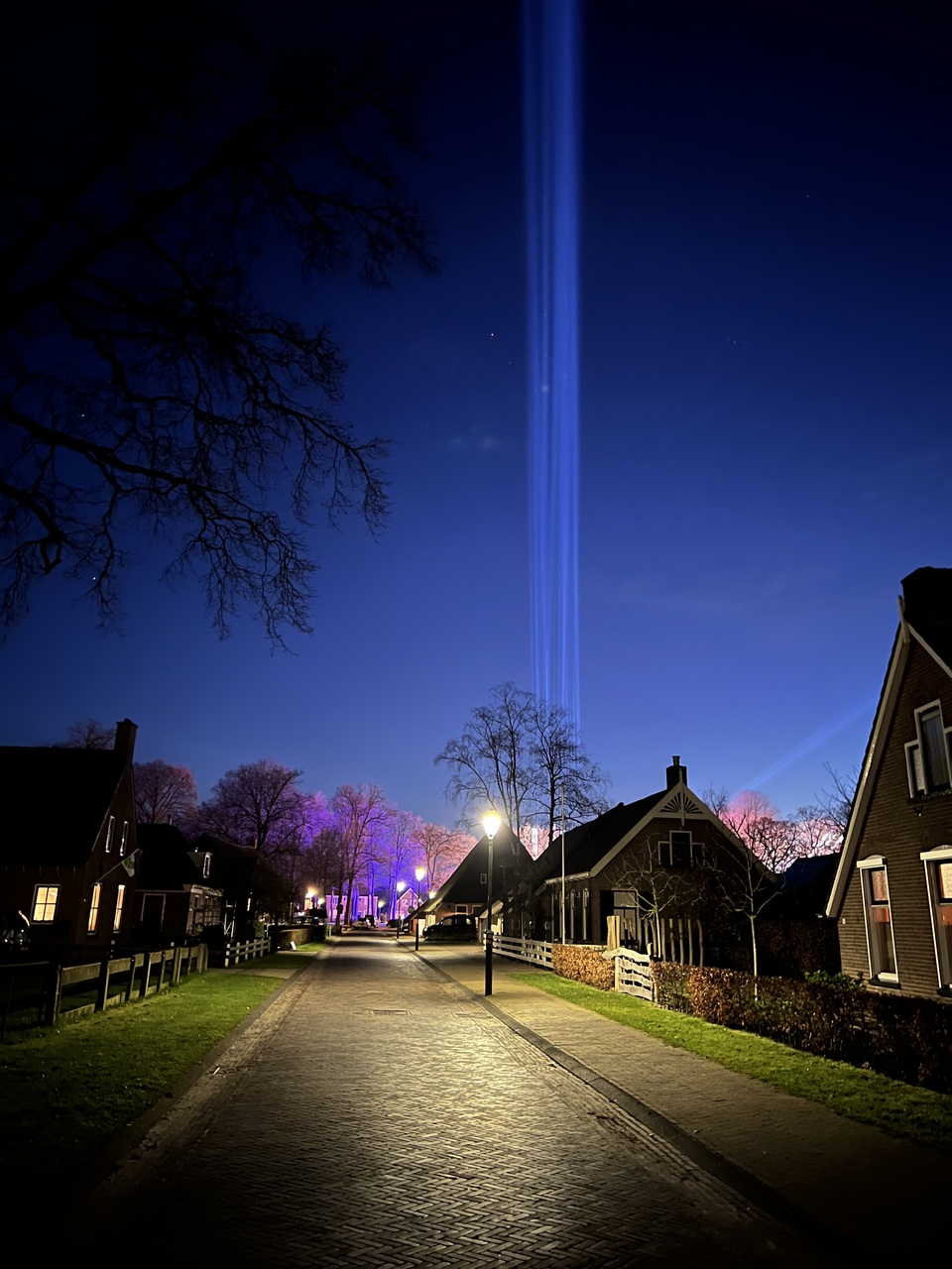 Deze foto is genomen in de avond van 1 april op De Weyert in Dwingeloo. Met uitzicht op de Brink. De lichtstraal die vanaf het grote podium de nachtelijke hemel verlicht staat symbool voor het verbond van God met de mensen.